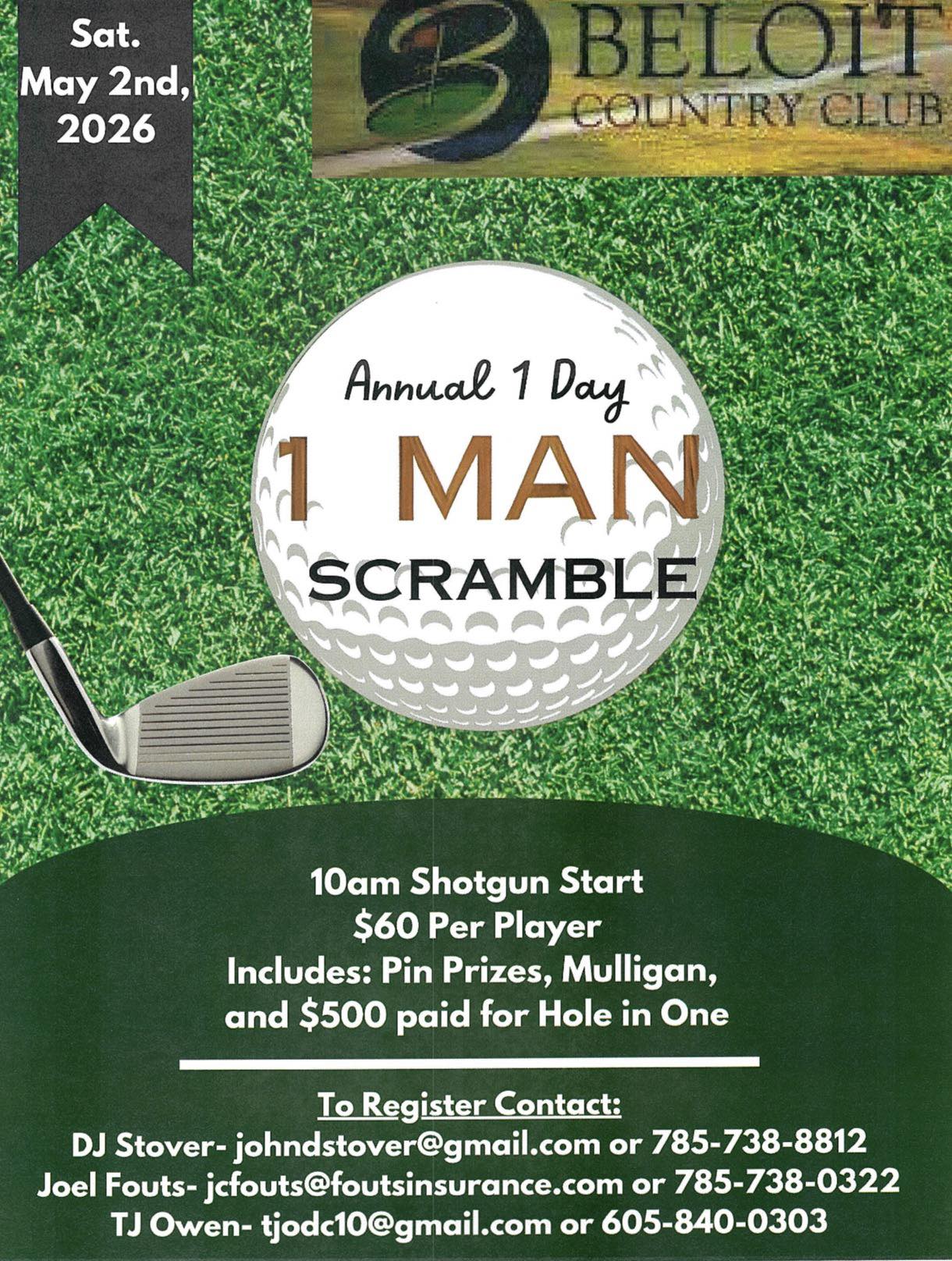 1st Annual 1-man scramble at the Beloit Country Club on Saturday, May 2 at 10 am. $60 per player. To register contact DJ Stover, 785-738-8812; Joel Fouts, 785-738-0322; or TJ Owen, 605-840-0303.