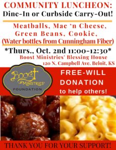 A free-will lunch to raise money for Boost Ministries Foundation. Lunch includes meatballs, mac & cheese, green beans and cookie....