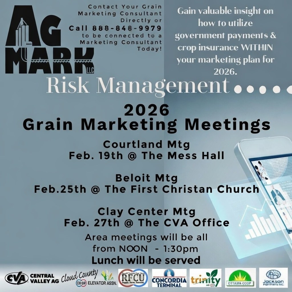 Gain valuable insight on how to utilize government payments & crop insurance within your marketing plan for 2026. Beloit First Christian Church on February 25 from noon to 1:30. Lunch will be served.