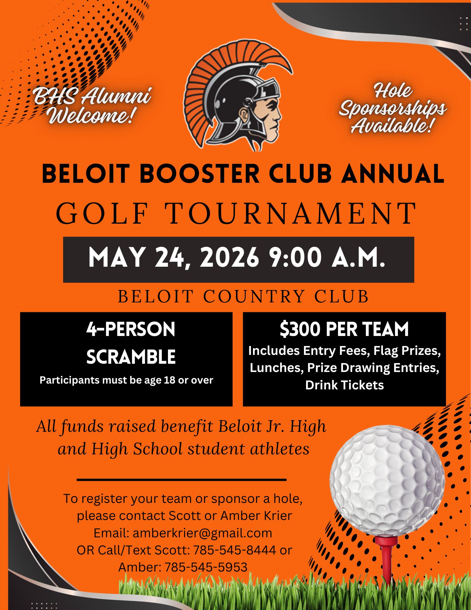 Sunday, May 24 at the Beloit Country Club. 4-person teams (must be over 18), $300 per team. All funds raised benefit the Beloit Jr/Sr High School athletes. To sign up, contact Scott or Amber Krier, amberkrier@gmail.com, 785-545-8444 or 785-545-5953.