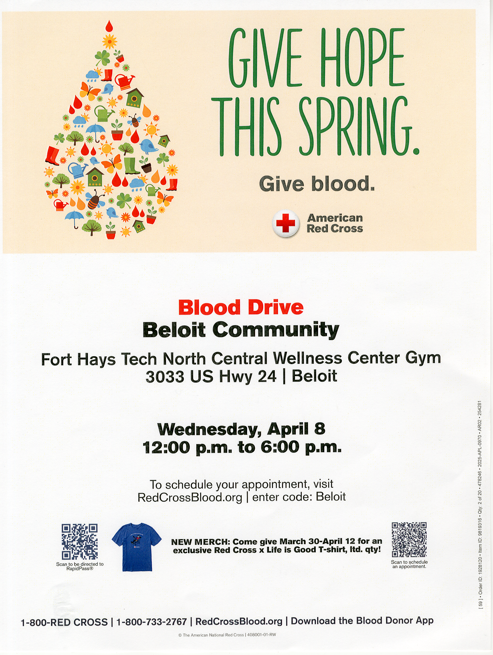 Give hope this spring-give blood! The upcoming Beloit Community Blood Drive will be Wednesday, April 8 from 12-6 pm at the NCK Wellness Center gym. To schedule an appointment, visit redcrossblood.org, with code “Beloit.”