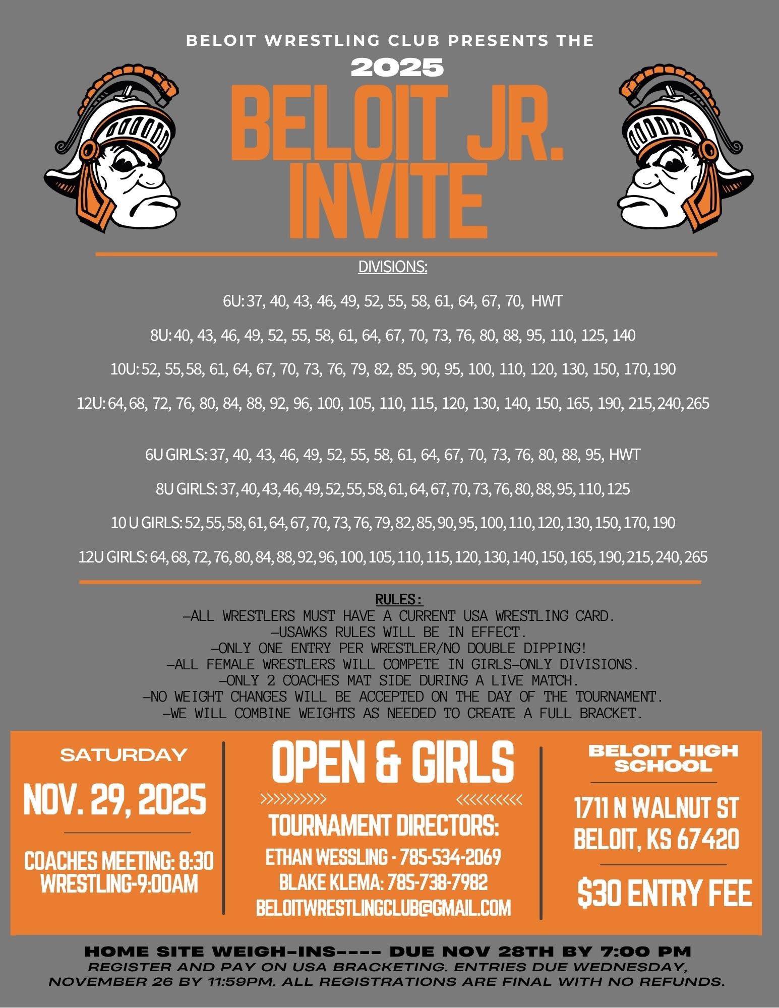 Beloit Wrestling Club presents the 2025 Beloit Jr. Invite. Open and Girls wrestling. Starts at 9 am. 6U through 12U....