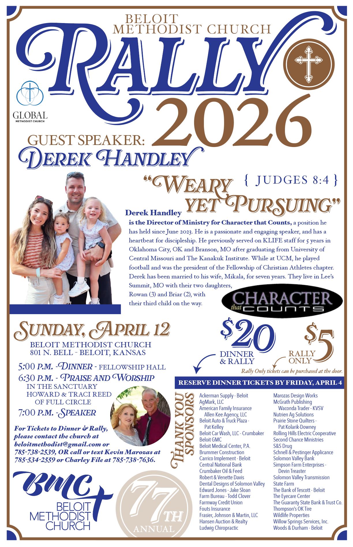 The speaker will be Derek Handley, Director of Ministry at Character that Counts. His speech is called “Weary, but Pursuing.” $20 for dinner and rally, $5 for rally alone. Email beloitmethodist@gmail.com or call the office at 785-738-2539 for tickets.