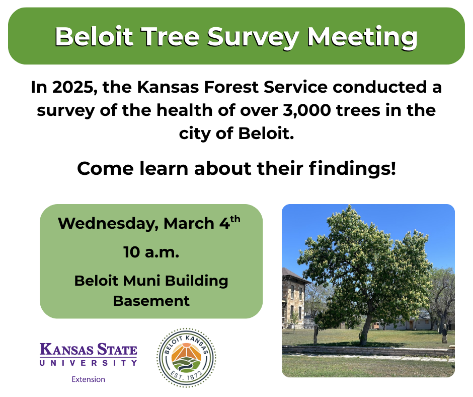 In 2025, the Kansas Forest Service conducted a survey of the health of over 3,000 Beloit trees. Come learn about their findings! Wednesday, March 4, 10 am, Beloit Municipal Building basement.