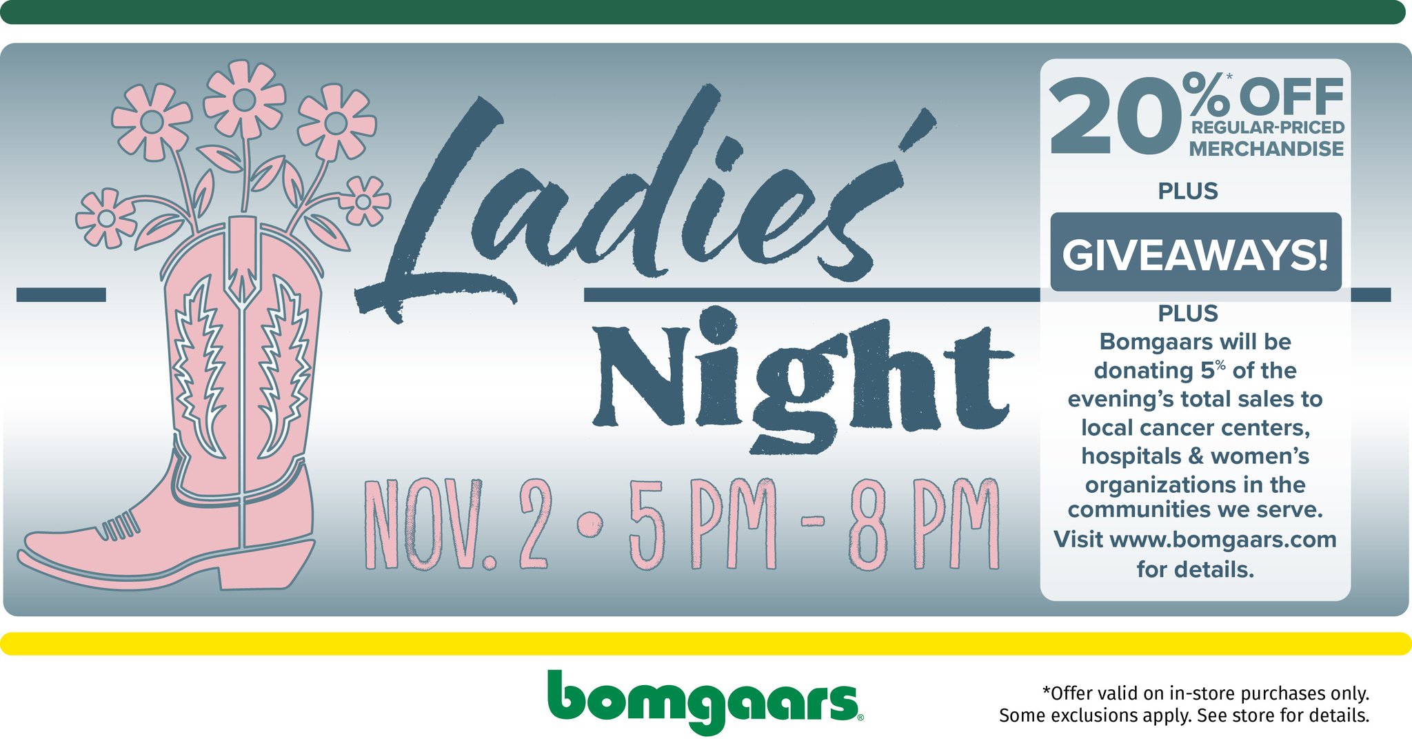 20% OFF regular-priced merchandise and LOTS of giveaways! Come do some early holiday shopping at Bomgaar’s to find great deals...