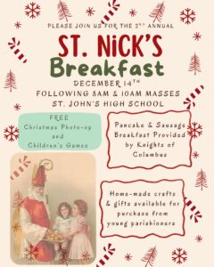Knights of Columbus is providing a breakfast at 9 am and 11 am on Sunday, December 14 at St. John’s...