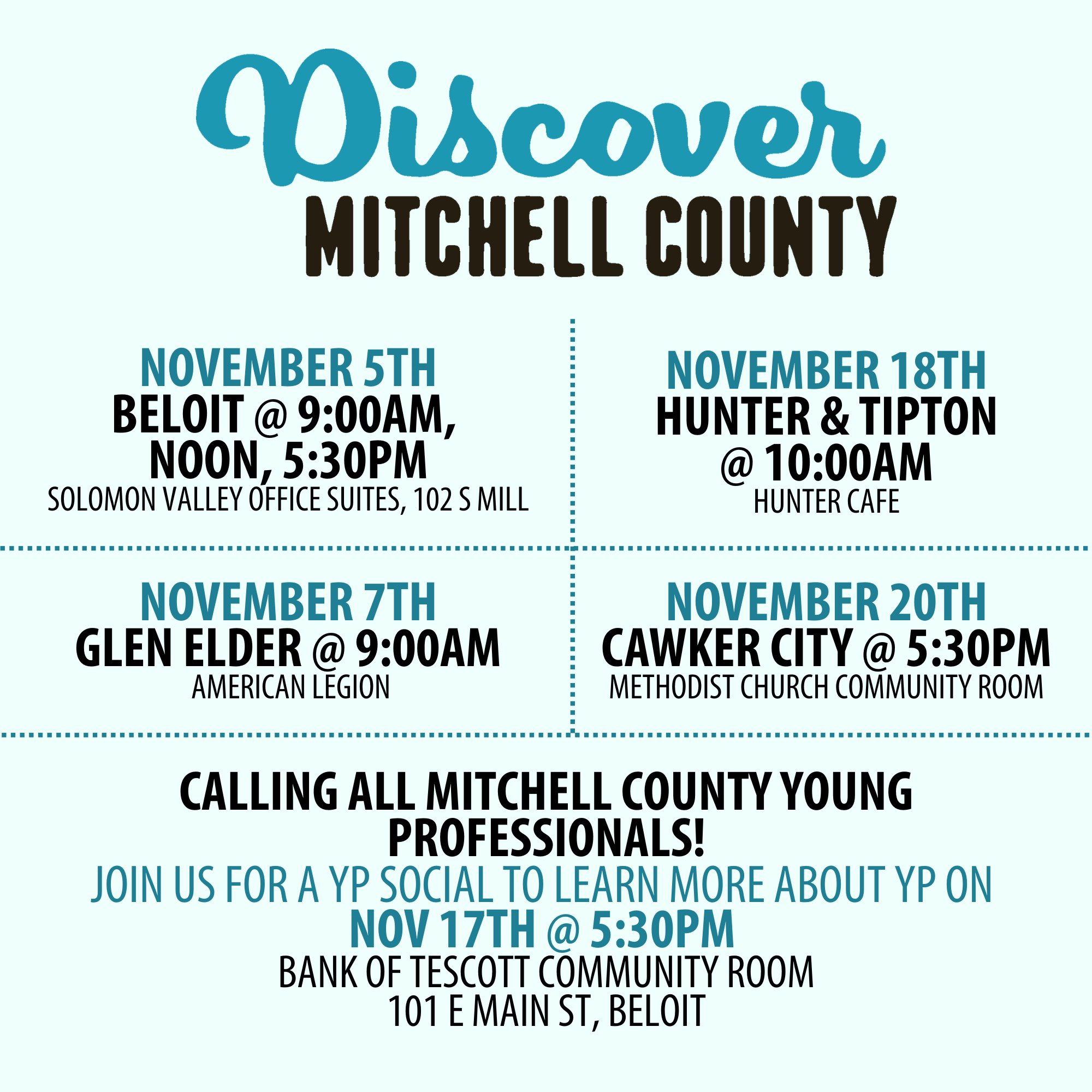 Join us in discovering the value in investing in Discover Mitchell County! Our new partnership between economic development, chamber, tourism and young professionals, will champion local businesses, facilitate future growth and leadership, embrace tourism, foster vibrant and collaborative communities. Cinnamon rolls will be served.