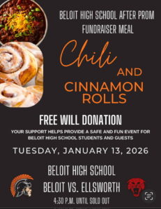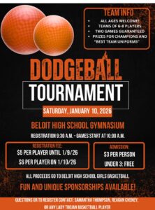 Mark your calendars! The Trojan girls basketball team has a fun event planned! This is for all ages 5 to 75! Some “incentives” are available for those teams who may be a bit older or younger than the teenagers’ teams! Saturday, January 10 at 9:30 am at Beloit High School Gym. Teams of 6-8, 2 games guaranteed, prizes for champions and best dressed! $5/player through 1/9/26 and $6/player after.