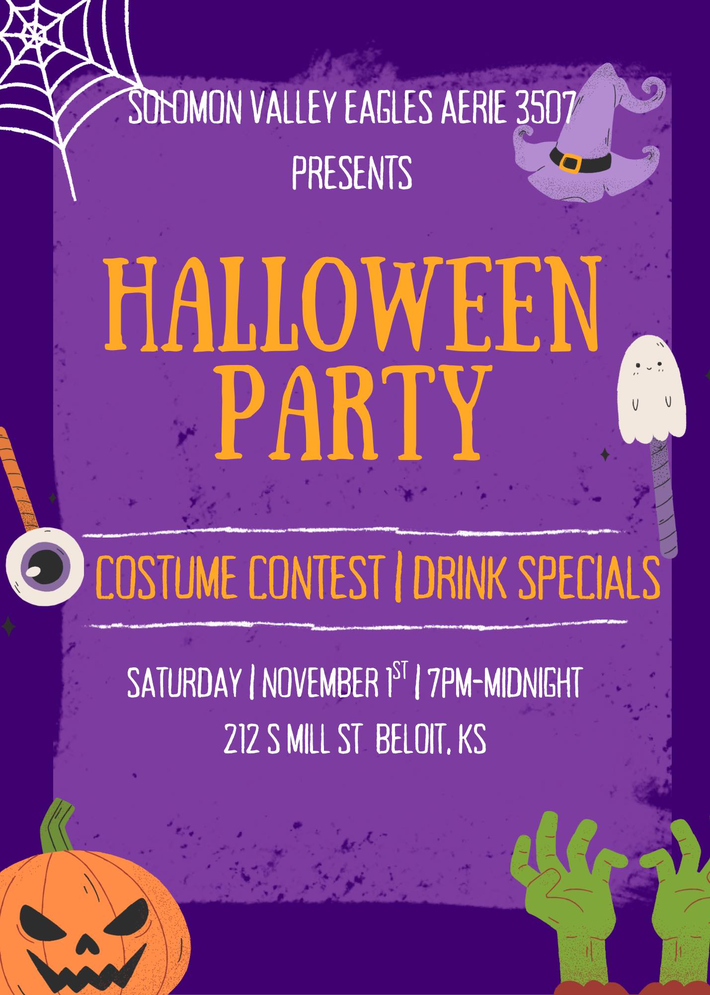 Solomon Valley Eagles will host a Halloween Party on Saturday, November 1 from 7-midnight. A costume contest will be held...