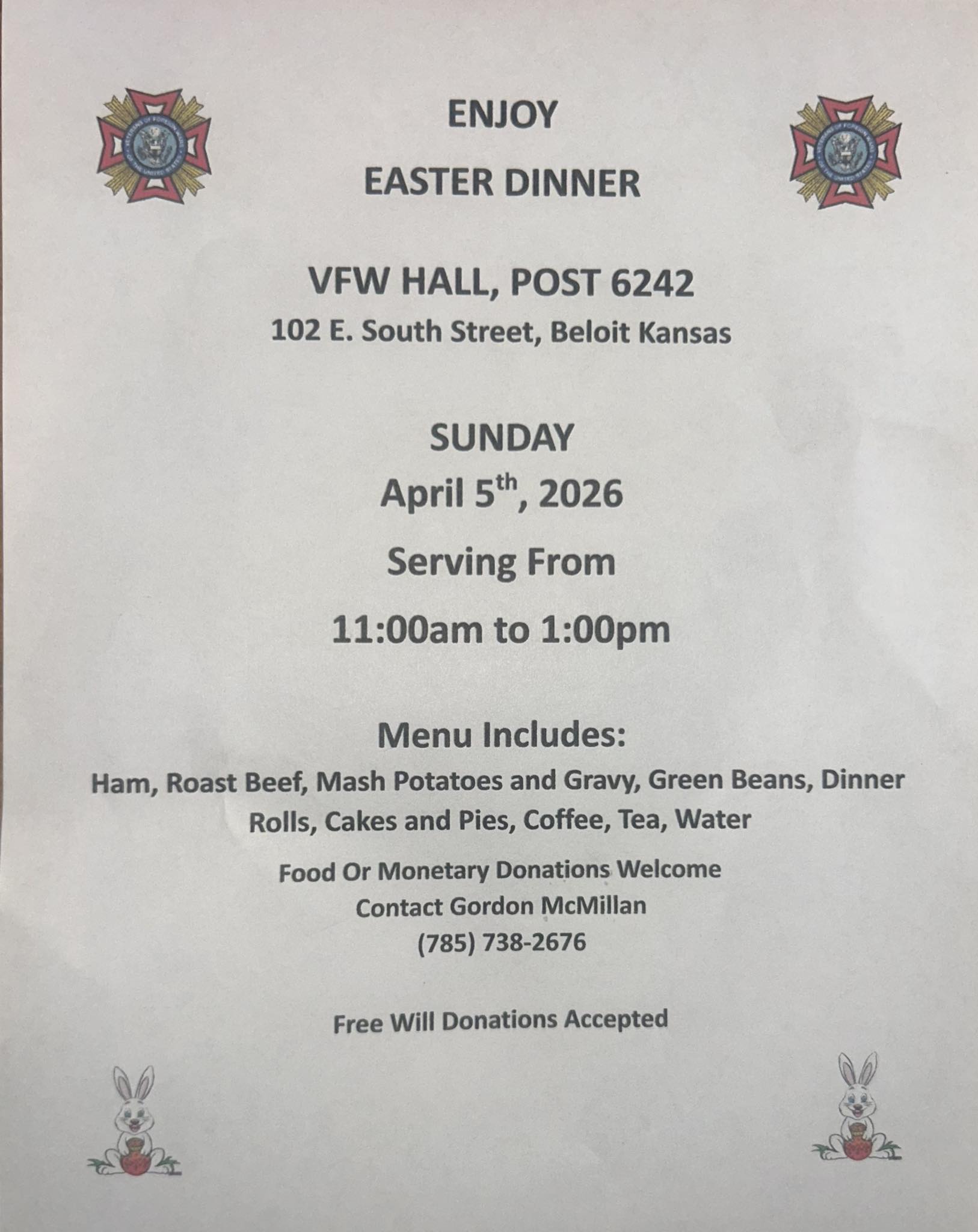 Easter dinner will be offered at the Beloit VFW, Post 6242, on Sunday, April 5 from 11 am to 1 pm. Free will donation is accepted.
