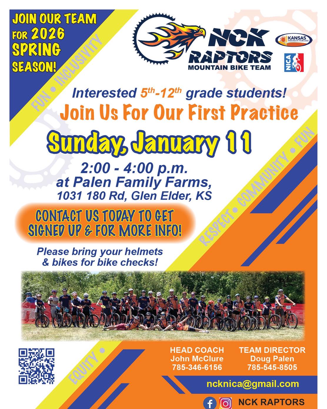 Join the team for the 2026 race season, 5th-12th graders! Team bikes are available. Sunday, January 11, 2-4 pm at Palen Family Farms, 1031 180 Rd., Glen Elder.