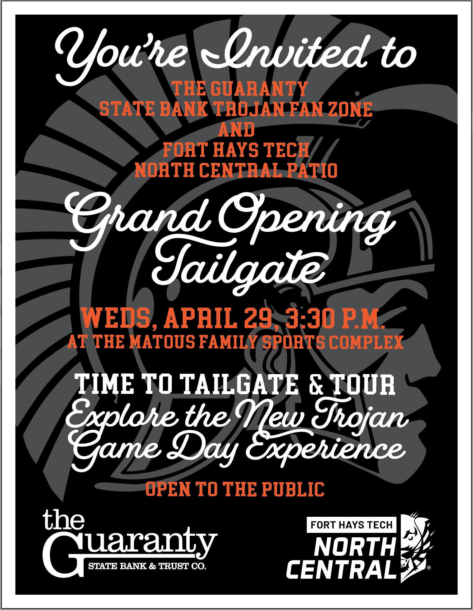 Time to Tailgate & Tour – Explore the New Trojan Game Day Experience. The Guaranty State Bank and Fort Hays Tech North Central Patio will be open at the Matous Family Sports Complex starting at 3:30 for a tailgate. Open to the public.