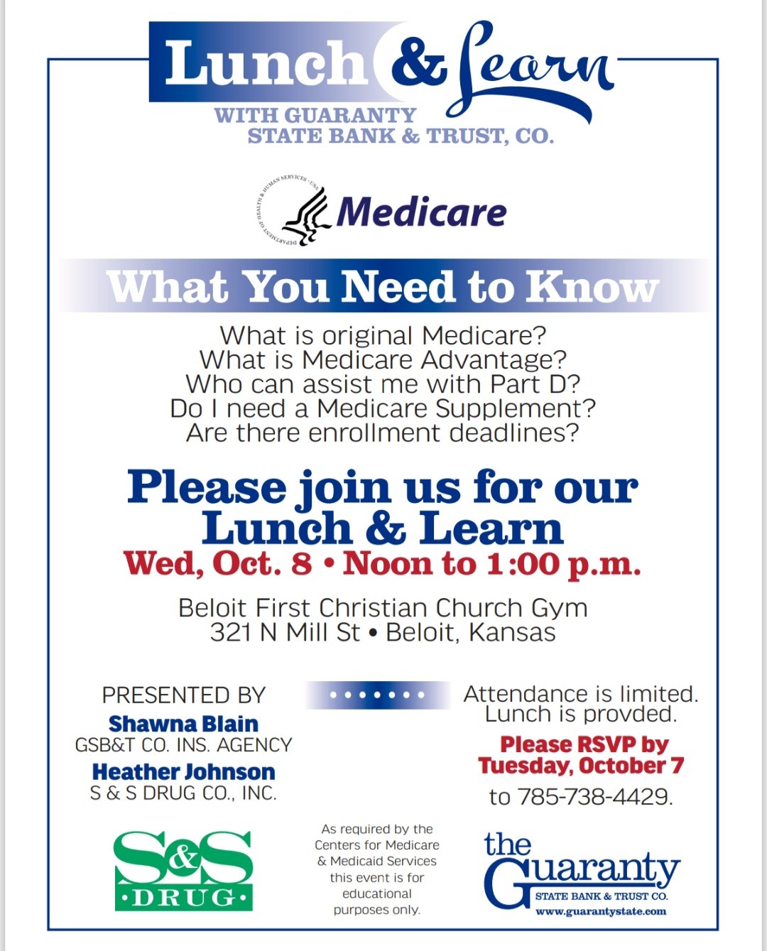 Join us for a free lunch & learn sponsored by the Guaranty State Bank. Meeting at Beloit Christian Church, Wednesday, October 8, 12-1. Lunch is provided. Call 785-738-4429 to RSVP. Spots are limited.