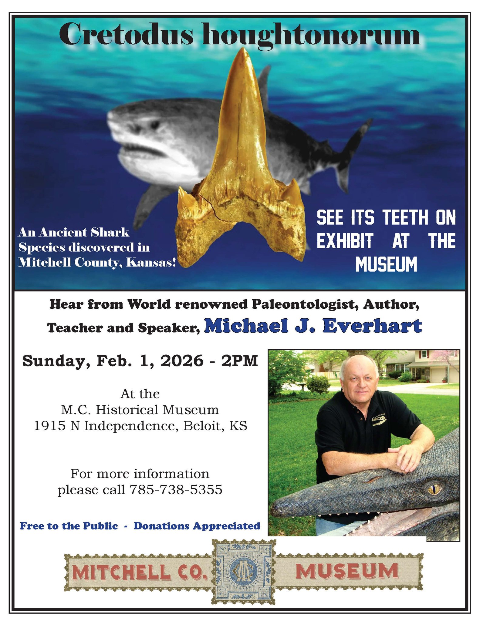 The annual meeting will have speaker Michael J. Everhart, world-renowned paleontologist, author, teacher and speaker. See the ancient shark species teeth discovered in Mitchell County! Sunday, February 1 at 2 pm at the museum. Free to the public, donations welcome.