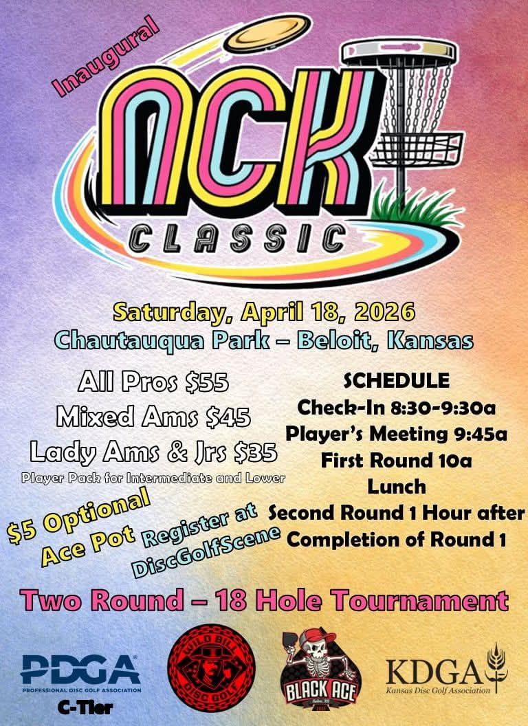 Saturday, April 18, 10 am at Chautauqua Disc Golf Park in Beloit will be the Inaugural NCK Classic. Register at DiscGolfScene. Two round, 18 hole tournament.