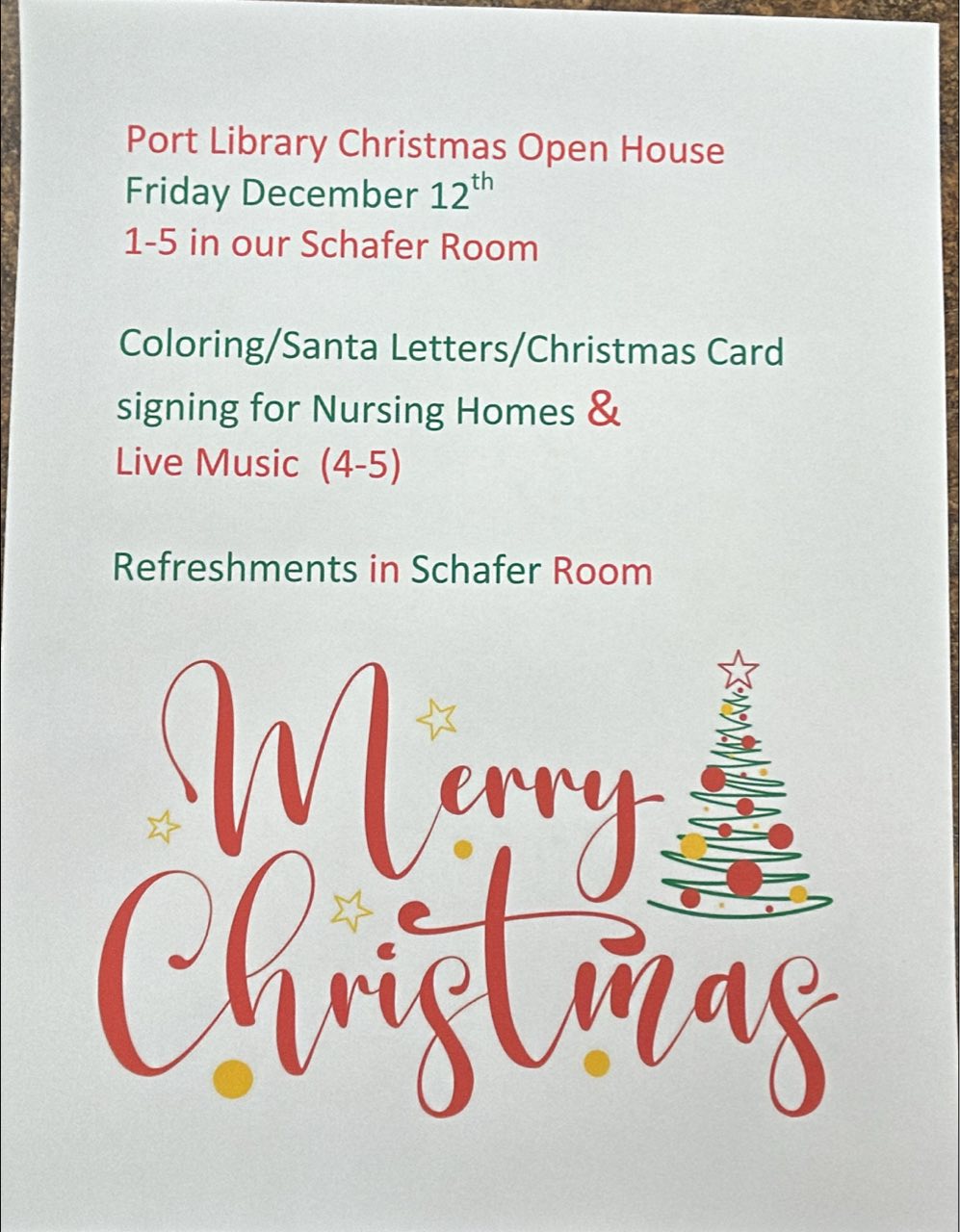 Friday, December 12 from 1-5 pm the Schafer Room will have treats, crafts, Santa letters, and making cards for the nursing home. Live music from 4-5. Stroll through the decorated library.