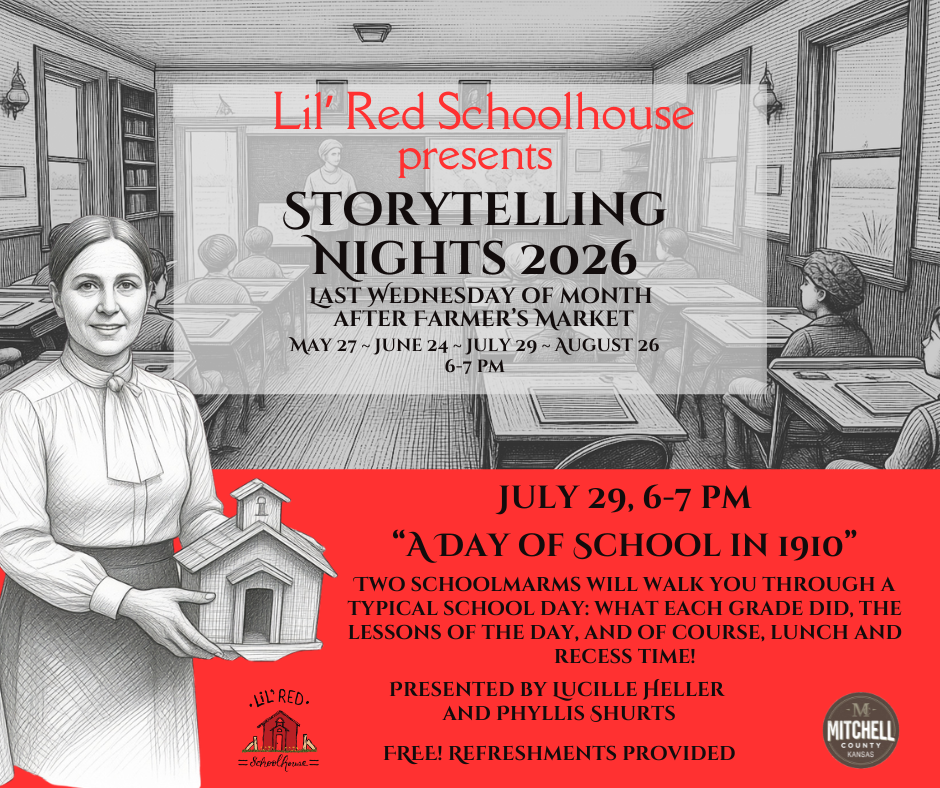 A free event at the Lil’ Red Schoolhouse to help keep the history of Mitchell County alive! Bring your parents and kids to a night with Lucille Heller and Phyllis Shurts who will be the “Schoolmarms” for the evening. The audience will be the “Class” and will they will take you through a typical school day in 1910. Wednesday, July 29 from 6-7 pm after the Farmer’s Market.