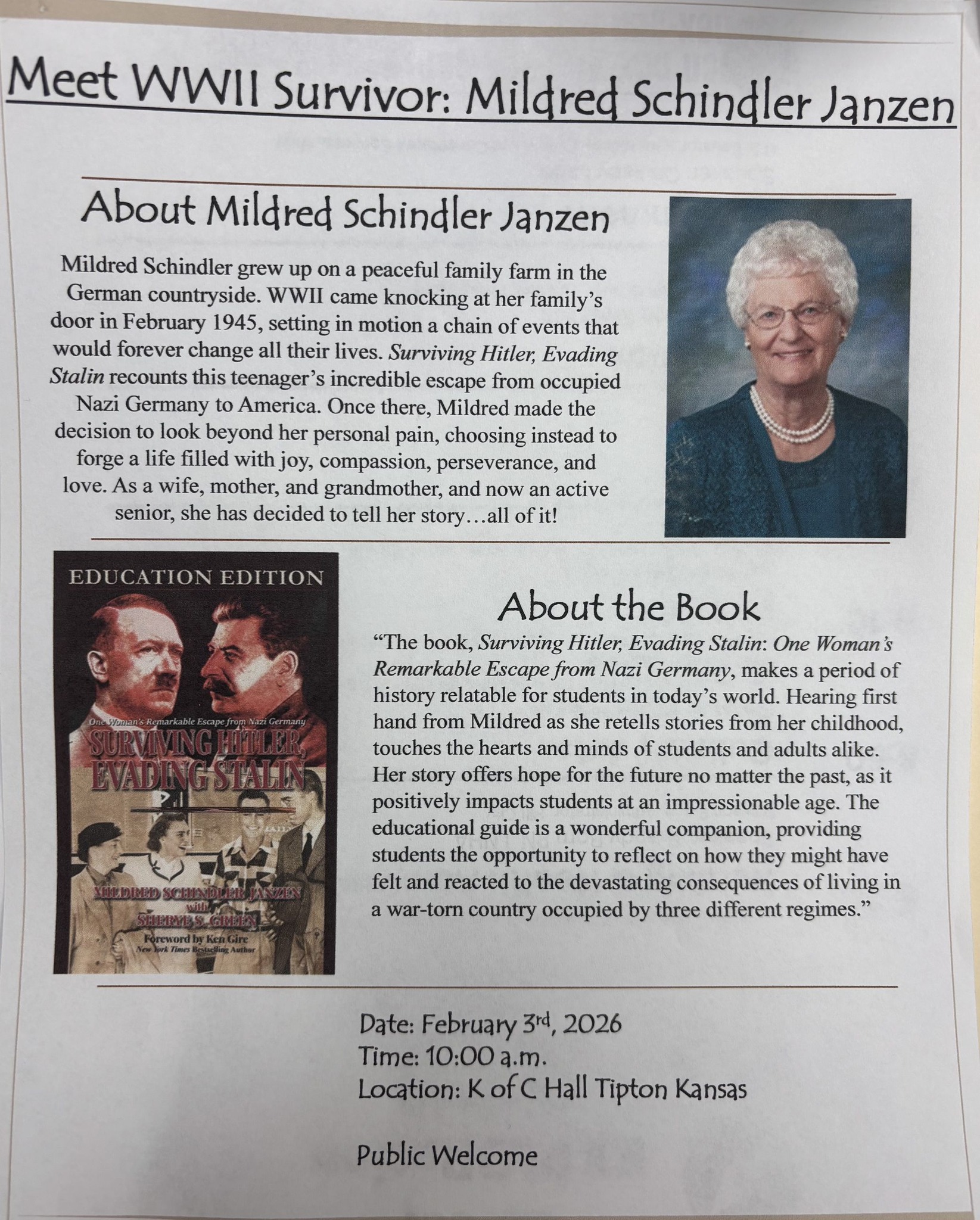 Author and WWII survivor, Mildred Schindler Janzen, will talk about her time as a teenager during WWII in Germany. Her book, “Surviving Hitler, Evading Stalin: One women’s remarkable escape from Nazi Germany,” will be available for purchase. Tuesday, February 3, 10 am, K of C Hall, Tipton. All public welcome.