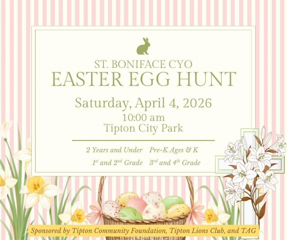 St. Boniface CYO is sponsoring this year’s Tipton Easter egg hunt at Tipton City Park, Saturday, April 4, 10 am. Ages 2 to 4th grade are invited.