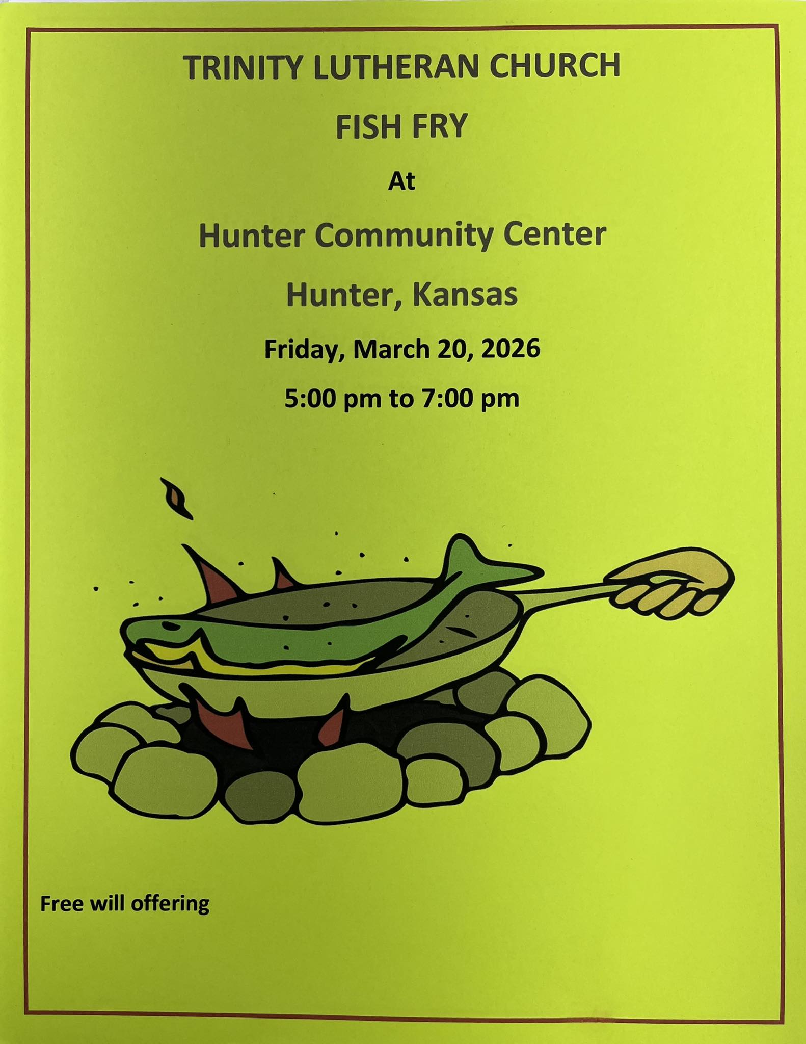 A fish fry at the Hunter Community Center on Friday, March 20 from 5-7 pm. Free will offering.