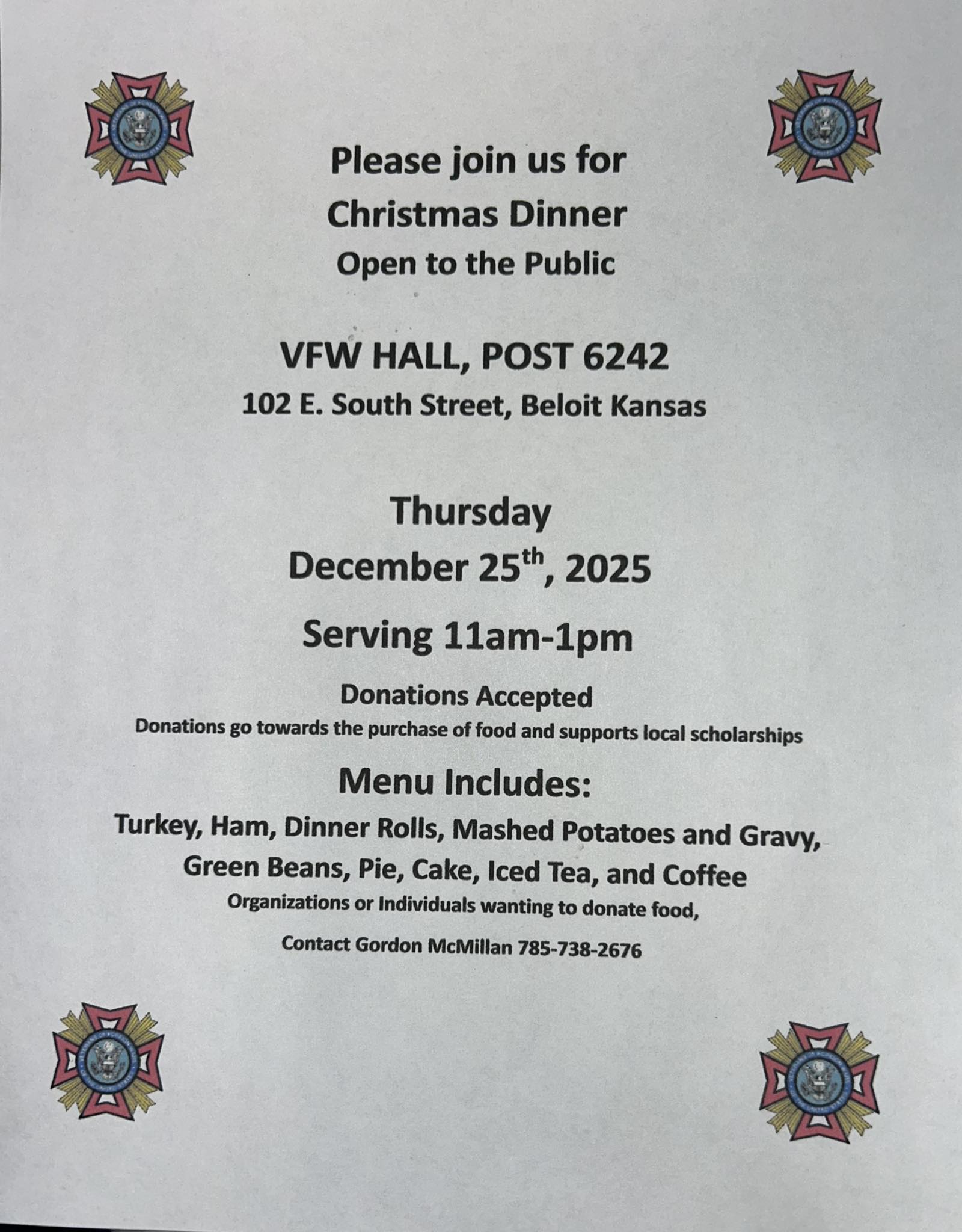 Free Christmas dinner with donations welcome. Thursday, December 25 from 11 am to 1 pm at VFW, 102 E. South St., Beloit.