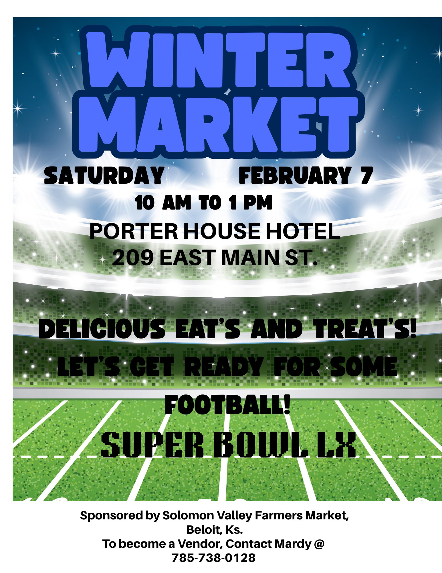 A Winter Market will be set up at The Porter House, 209 E. Main, Beloit. Delicious food will be available for purchase to get you ready for the Super Bowl! Saturday, February 7, 10 am to 1 pm.