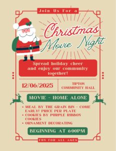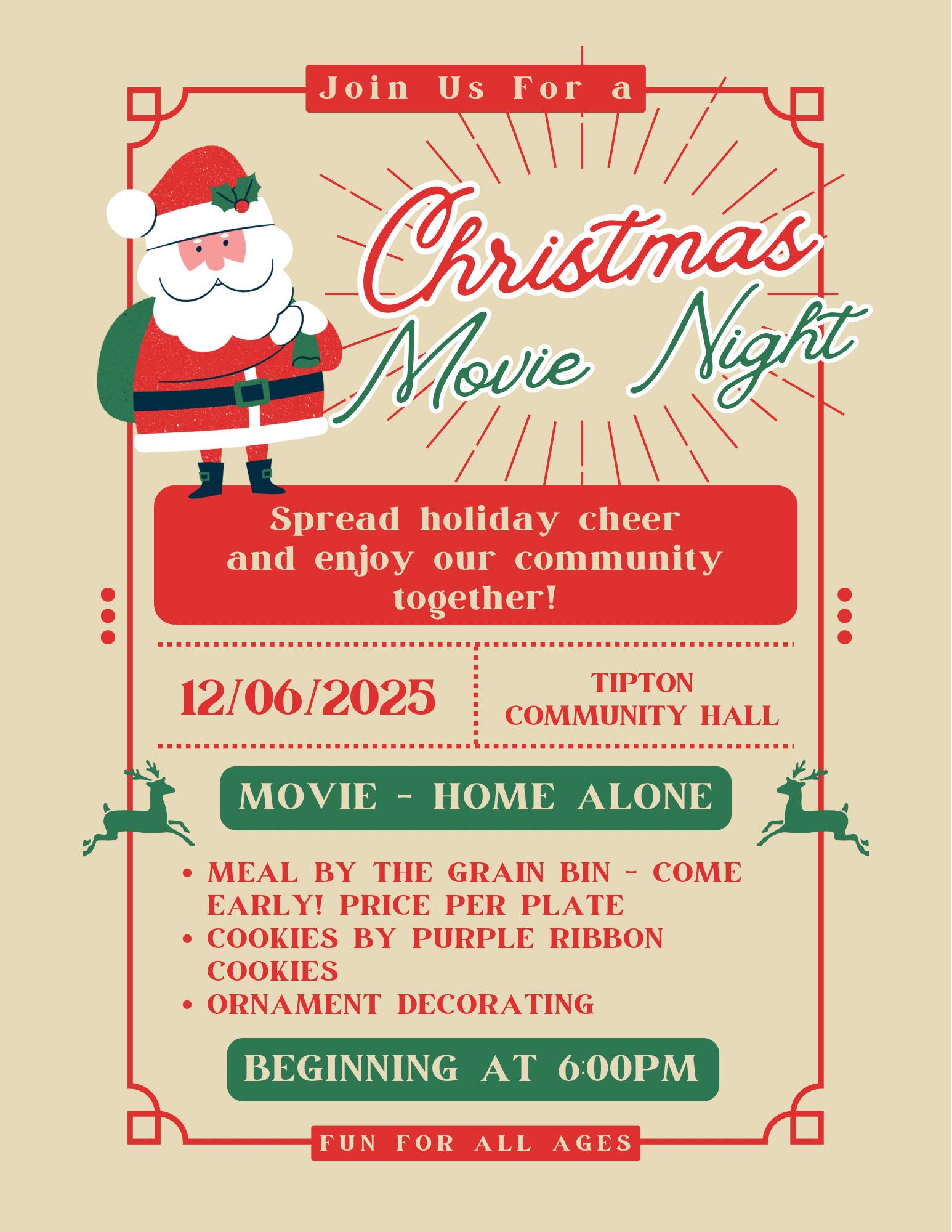 Tis the season! Saturday, December 6th 6:00pm. Come see us in Tipton Kansas!Supper (priced per plate) at the hall by The Grain Bin Food Truck & EateryDessert by Purple Ribbon CookiesOrnament decorating and movie “Home Alone.”