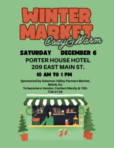 Shop for homemade items that are great for gift-giving this holiday season! Pies, casseroles, tamales, breads, rolls, soups, and more. Want to be a vendor? Contact Mardy File at 785-738-0128. No booth fee! Open 10 am to 1 pm.