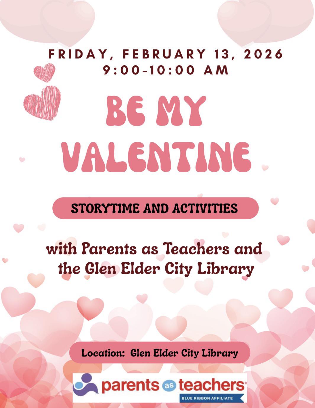 On Friday, February 13 from 9-10 am, take your little ones to the Glen Elder Library for a story time and Valentine activity with Parents as Teachers and the Glen Elder City Library!
