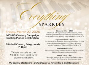 March 27, 2026 Colorado Keys Dueling Pianos Doors open at 7 pm Mitchell County Fair Building Limited tickets by advance purchase starting January 30th at the MCHHS front desk.