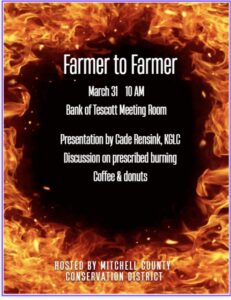 Farmer to Farmer presentation by Cade Rensink, KGLC at Bank of Tescott Room, Beloit on Tuesday, March 31 at 10 am. Coffee and donuts will be available.