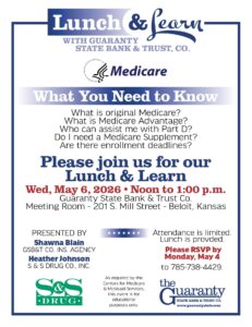 Join Guaranty State Bank and S&S Drug for a Lunch & Learn about Medicare. Wednesday, May 6, 12-1 pm, Guaranty State Bank Meeting Room, 201 S. Mill St., Beloit. Attendance […]