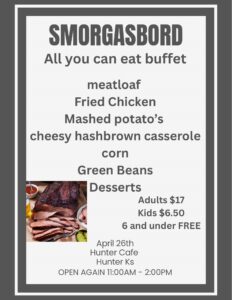 All you can eat buffet. Meatloaf, fried chicken, mashed potato, cheesy potato hashbrowns, corn, green beans, desserts. Adults $17, Kids $6.50, under 6 free. Hunter Cafe, Sunday, April 26, 11 […]
