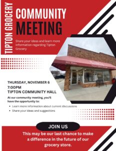 Come to a community meeting at Tipton Community Hall to learn more about the current situation of Tipton Grocery. Brainstorm...