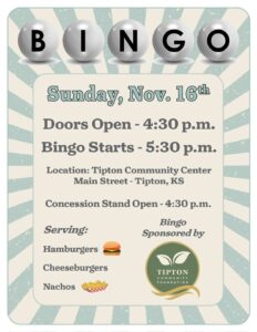 Bingo is back in Tipton! Doors open at 4:30, bingo starts at 5:30. Serving hamburgers, cheeseburgers and nachos. Sponsored by...