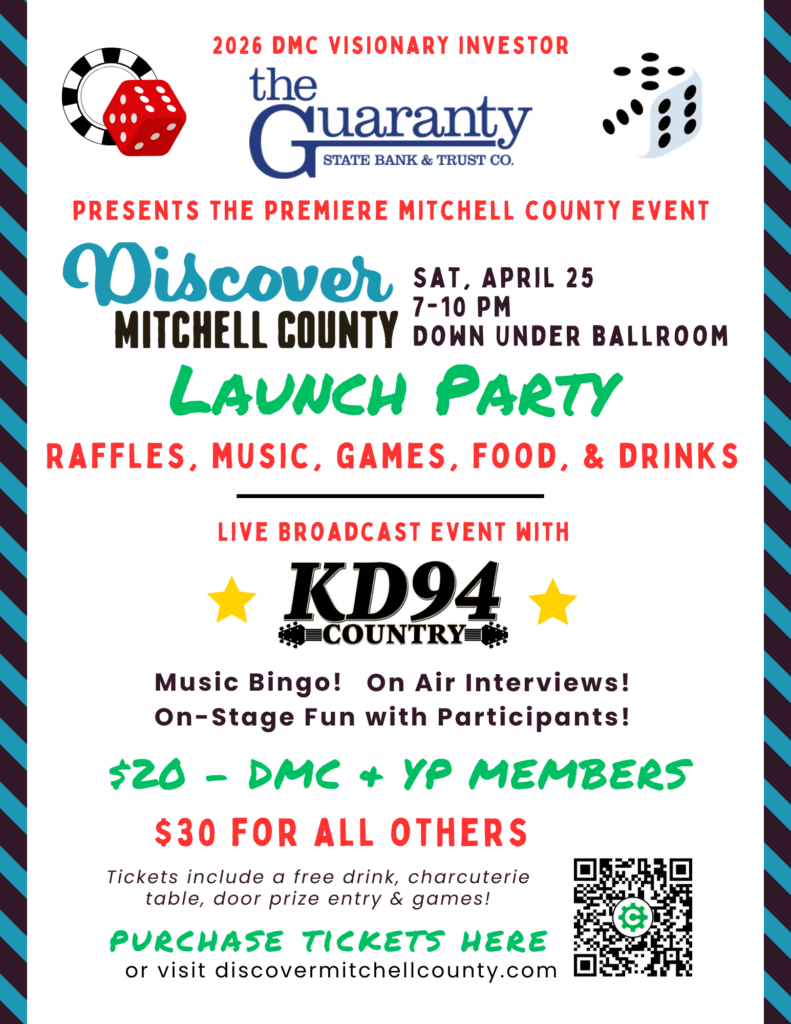Get ready for the LAUNCH PARTY of Discover Mitchell County, partnered with KD Country, we’re bringing games, charcuterie, drinks and plenty of FUN!