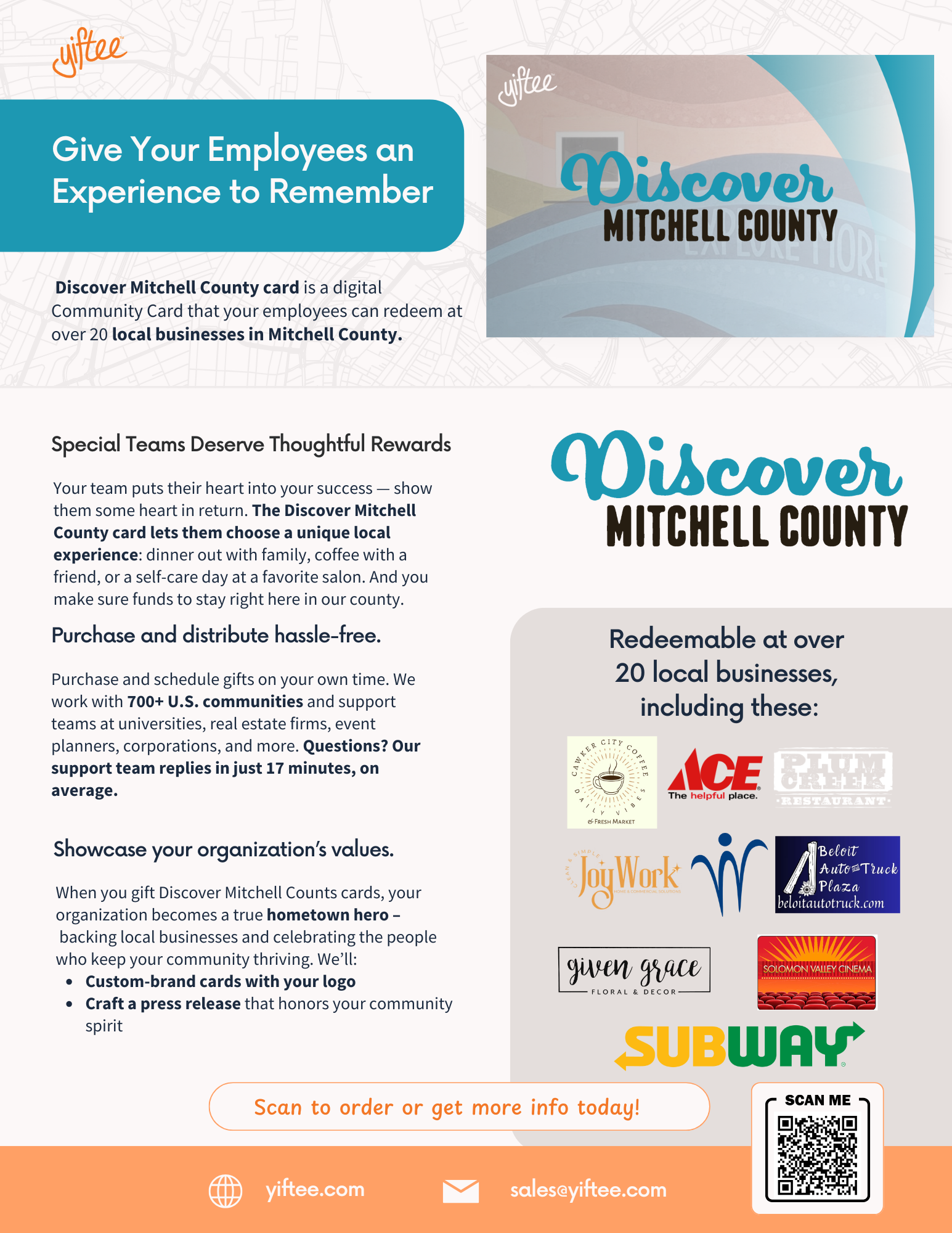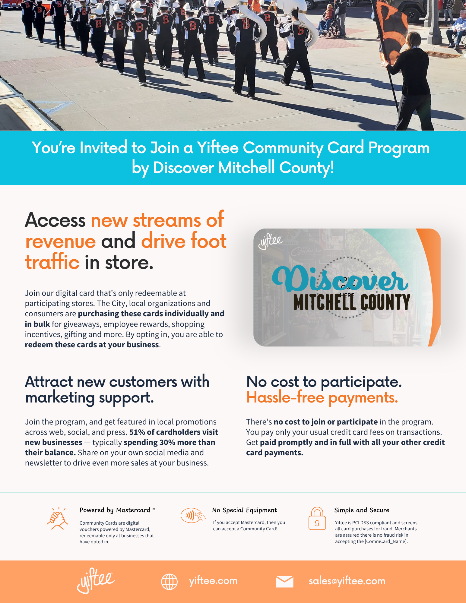 Discover Mitchell County has many of your favorite retailers, restaurants, services and entertainment in one place. Use the Discover Mitchell County gift card at all participating locations in the region. There is truly something for everyone! By purchasing our Mitchell County eCards, we’re making sure dollars stay local! Thank you for your support!